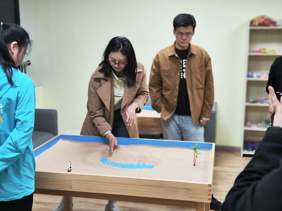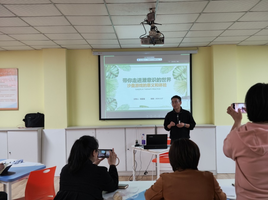杨老师以“带你走进潜意识的世界”为题,全面阐述了沙盘游戏对于提升工作能力,增强自我认知的重要意义。杨老师说到,此次活动旨在通过玩沙感受自然,回忆童年,倾诉自己的心声,再以玩沙带给人们自由、放松、休憩的感觉,给来访者提供一个自由、释放、受保护的空间。随后,杨老师亲自指导,向在场各位老师介绍了沙盘游戏的起源、玩法和其对个人心理成长的积极影响。