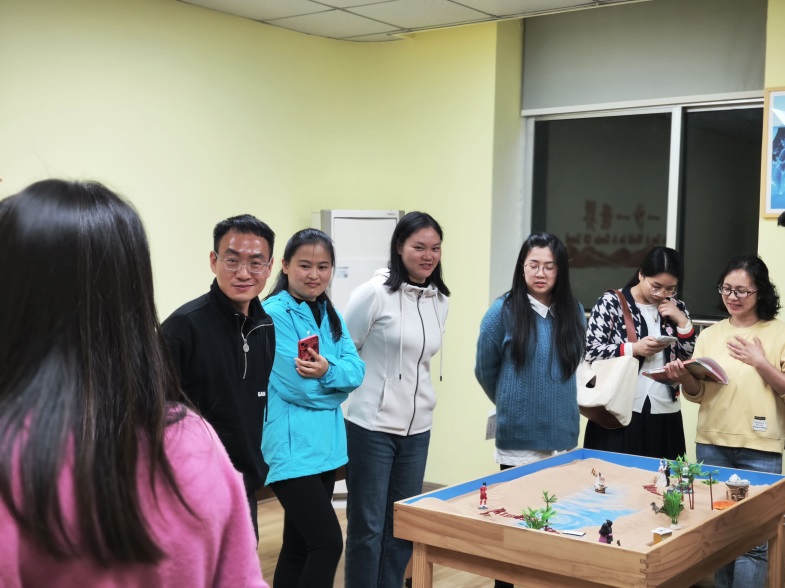 杨老师对辅导员完成的沙盘进行了深入研究探讨,并分享了其中的一些见解,同时也强调了“在自己的世界中,用自己的一些时间在自己的世界里神游一番,尽可能详细地去品味这个世界的一切,不仅仅用眼睛,还要用心去理解自己的这个世界”。