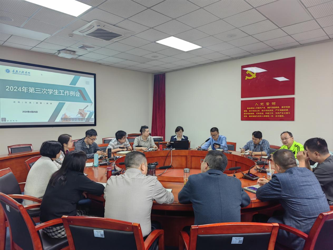 2024 年4月25日上午,学生处在行政楼107会议室召开了本年度第三次学生工作例会。会议由学生处处长黄燕主持,学校副校长王建东、各二级学院党总支书记、学生科科长参与。