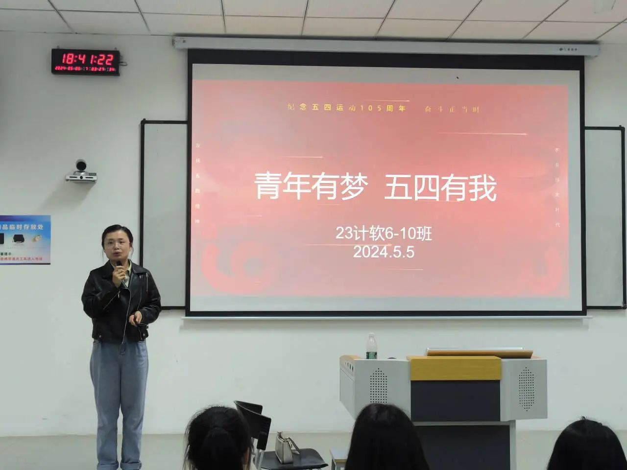 为弘扬五四精神,激励青年学生担当起新时代的使命。近日,重庆工程学院双桥校区软件学院23计软6-10班在第一教学楼101教室开展了“青年有梦,五四有我”主题班会活动,本次班会全程由辅导员邓蕾老师主持。