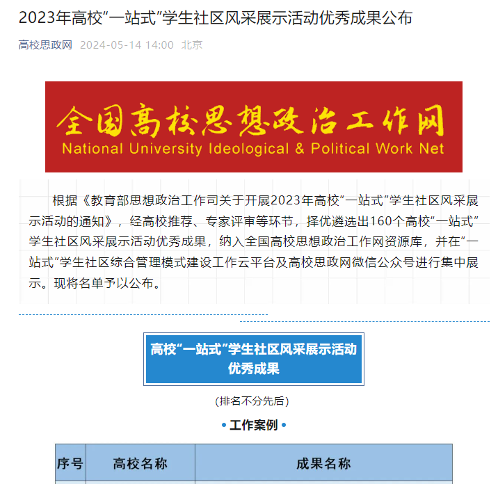 5月14日,全国高校思想政治工作网公布了2023年高校“一站式”学生社区风采展示活动的优秀成果入选名单,我校《党建+五育融合*数字赋能 打造学生社区素质教育新生态》工作案例获评2023年高校“一站式”学生社区风采展示活动优秀成果,纳入全国高校思想政治工作网资源库,并在“一站式”学生社区综合管理模式建设工作云平台及高校思政网微信公众号进行集中展示。