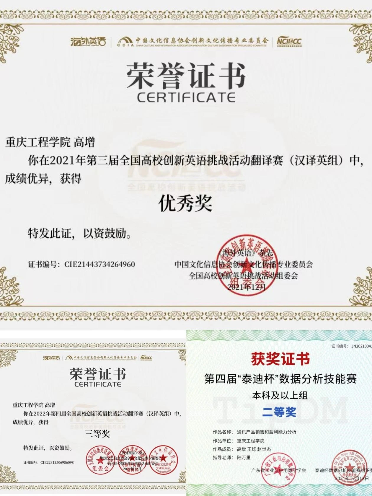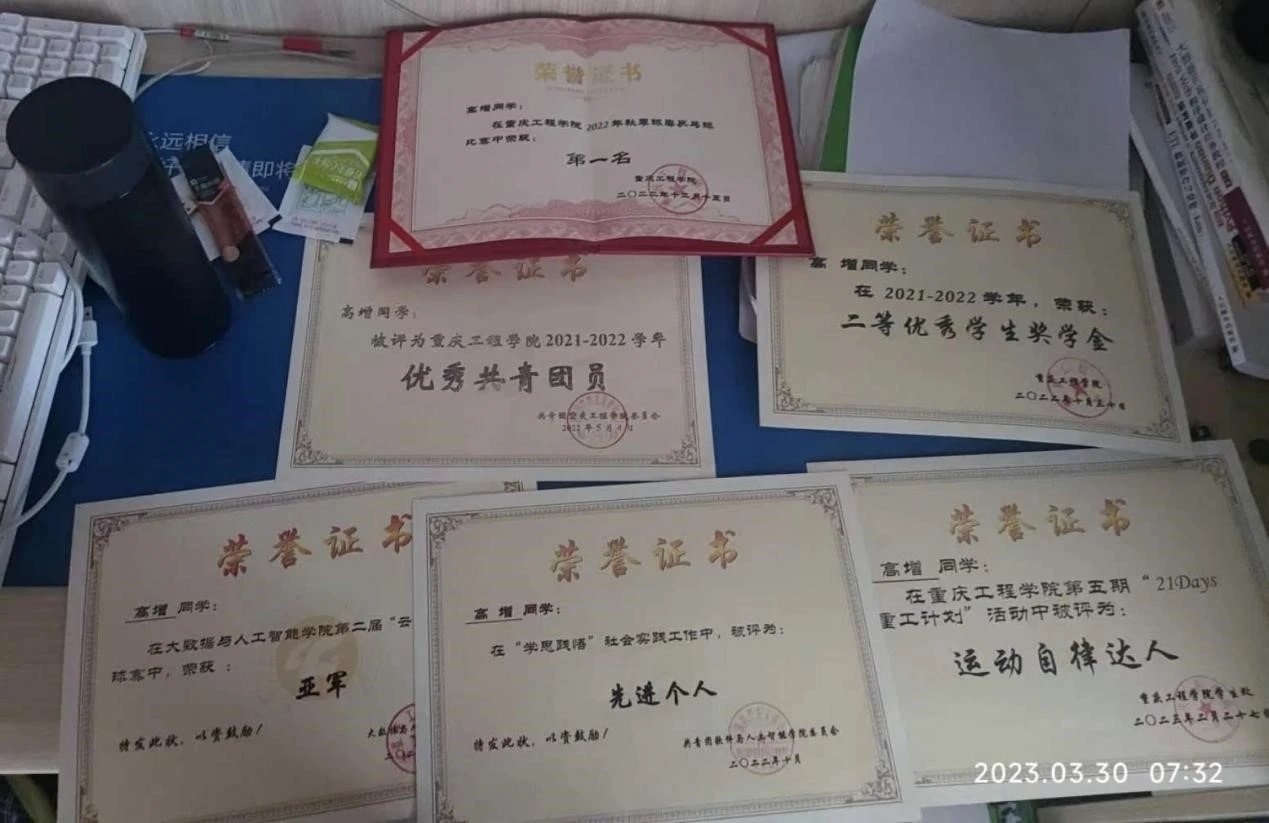 在大学期间他担任文体委员,注重身体健康和学习全面发展,获得国家励志奖学金3次、校级优秀奖学金3次、全国高校创新英语挑战活动翻译赛优秀奖,三等奖等等,累计获得国家级荣誉7项,18项校级荣誉,在空闲时间,他还会参加一些志愿活动来丰富自己的大学生活。