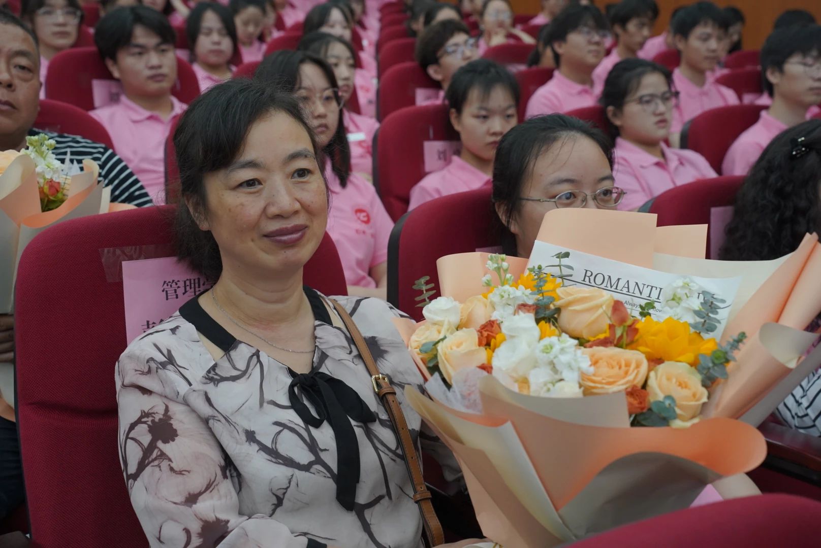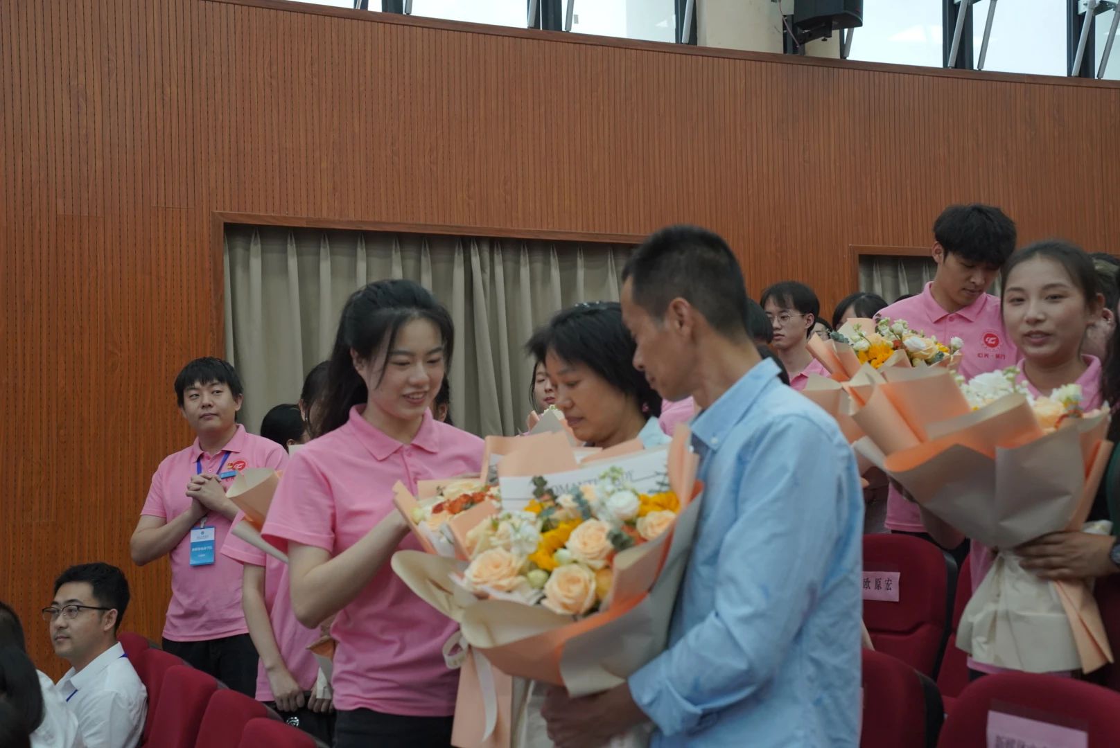 活动伊始,一首《以爱之名 感恩父母》深情的朗诵节目让现场观众感受到了浓浓的亲情。参与活动的学生伴着音乐和朗诵声步入会场,满怀感恩之情,向自己的父母献上美丽的花束。