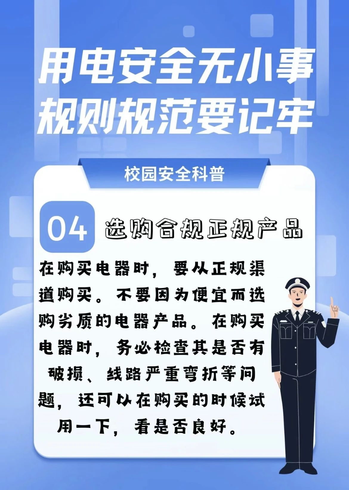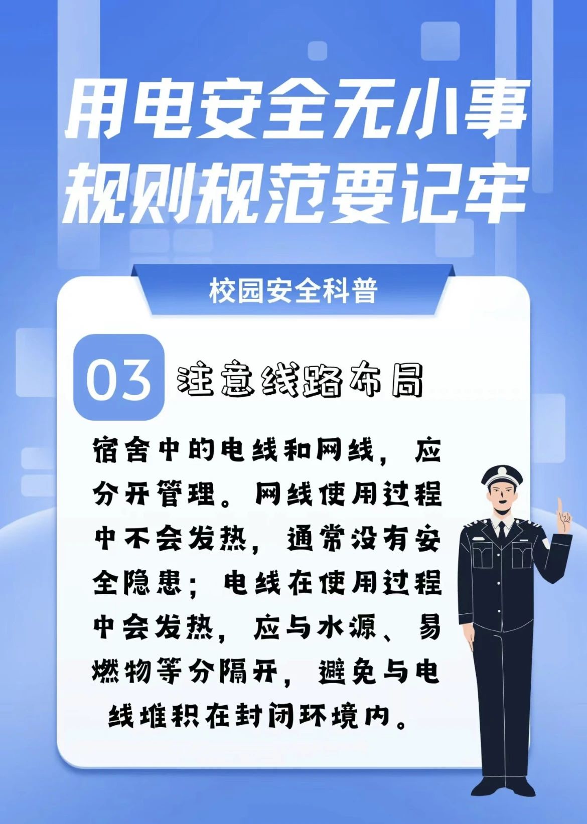 温馨小贴士:1.安全用电。不乱拉电线。一些宿舍存在随意走线的现象,电线线路混乱,有的搭在床铺上,有的绕在桌腿上,还有的靠近书箱。电线长期被踩压,很容易引起短路起火;注意充电设备安全。手机,电脑,充电宝,卷发棒等都需要充电,部分同学充上电后外出不切断电源,充电器长时间蓄热,热量无法散出,就很容易发生火灾。2.卫生规范。注意空气卫生,改善寝室空气卫生质量。夏天即将到来,炎热的天气,需要经常通风换气,早上起床后立即打开门窗通风,晚上睡觉时窗户也要留个通风口;做好每天的室内卫生。应做到床上平整,衣柜整洁、盆内无脏裤袜,鞋子及时换洗,地面无垃圾,洗漱台清洁,便池无异味等。