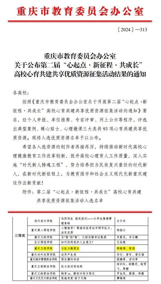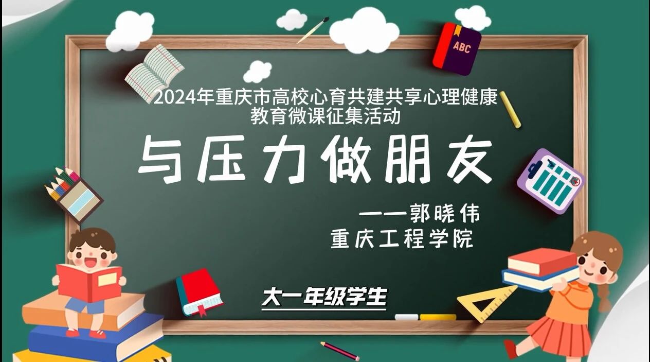 据重庆市教育委员会办公室发布的《关于公布第二届“心起点·新征程·共成长”高校心育共建共享优质资源征集活动结果的通知》,我校心理健康教育与咨询中心郭晓伟、张琼老师的《与压力做朋友》心理微课作品荣获心理微课类三等奖。