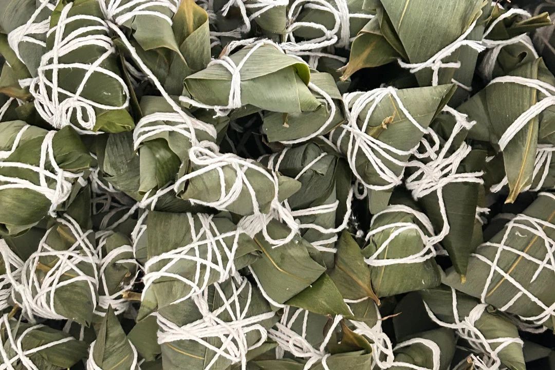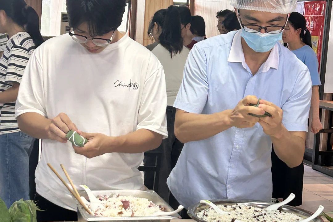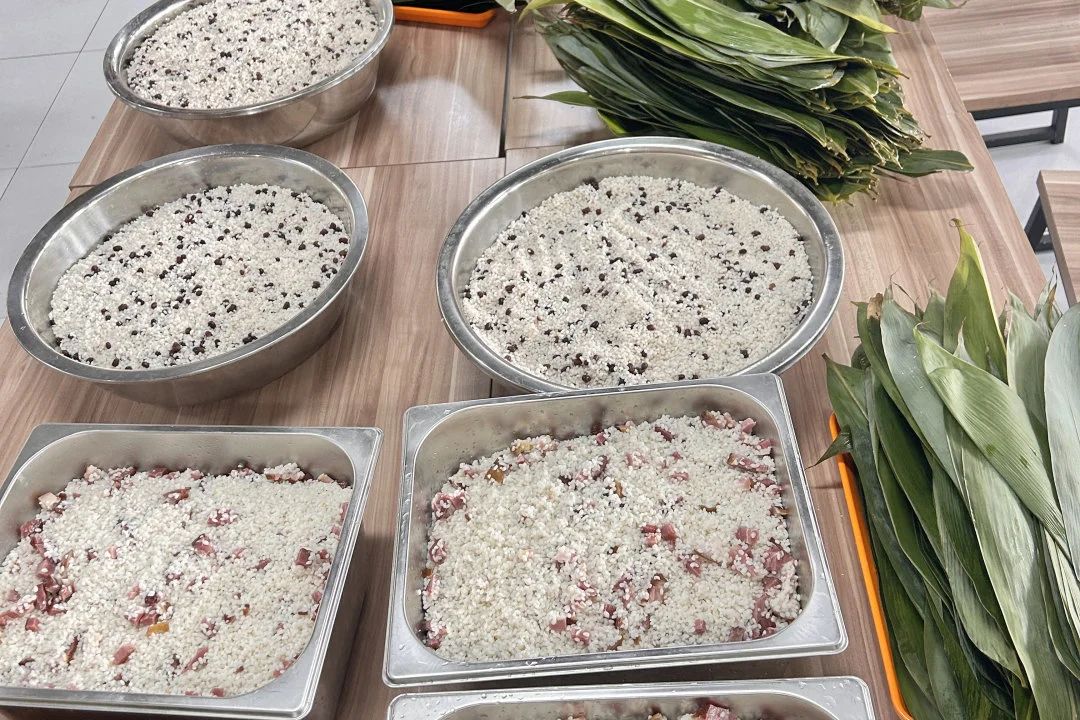 活动现场,大家围坐在一起,面前摆放着绿油油的粽叶、白花花的糯米和色彩不一的馅料;大家各显神通,熟练的将粽叶展开,放上足量的糯米和馅料,包出圆鼓鼓、菱角分明的粽子;渐渐地餐盘里盛装的粽叶越来越少,粽子越来越多,处处充满“收获”满满的欢声笑语,师生间情谊越来越浓。