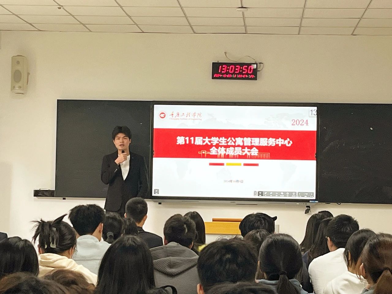 首先由学生助理团队负责人邬圣鱼同学向同学们介绍了大学生公寓管理服务中心的组织架构和各部门任务分工情况,勤工助学岗、生活部、组织部、新闻媒体部、办公室等各部门各司其职,共建学生社区、共享社区环境、共融社区理念,动员同学们发挥社区“头雁”作用,勇担社区建设“主人翁”身份。