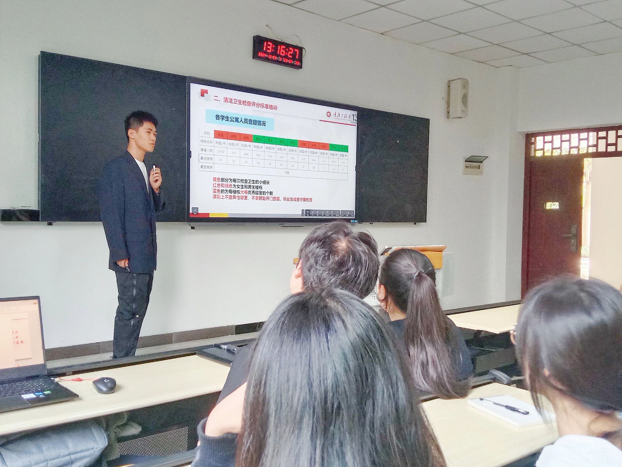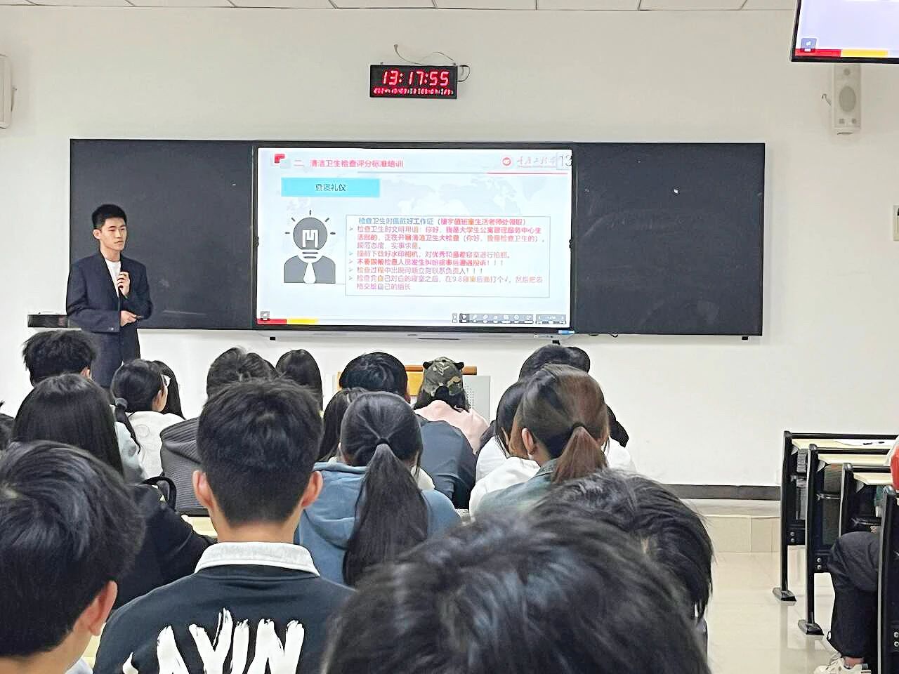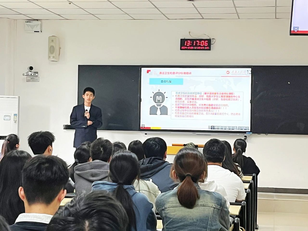 其次,中心生活部责任人之一谭程端同学对学生社区的清洁卫生检查工作流程做了详细培训,从工作准备、评分标准、最佳最差寝室推荐、数据通报等角度进行了细致的叮嘱,主要内容包括: