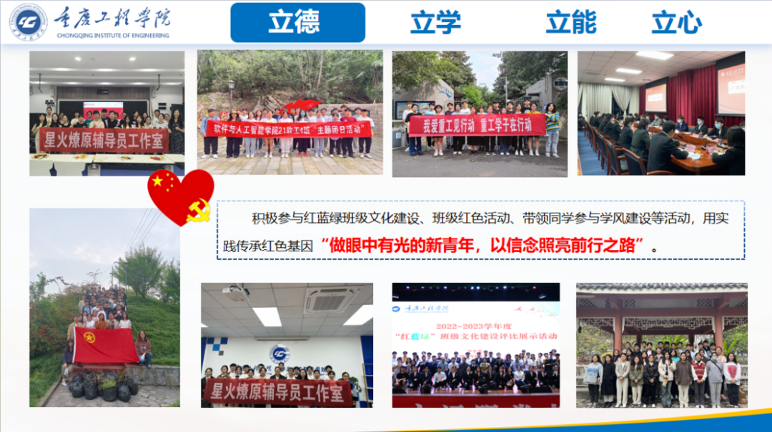 “星星之火,可以燎原”,自入学之初,她便投身于红蓝绿交织的班级文化织锦之中,引领同窗共筑学风之基,以行动为笔,红色精神为墨,书写着传承的篇章。誓做那眼含璀璨星辰的新青年,用实践传承红色基因做“眼中有光的新青年,以信念照亮前行之路”。