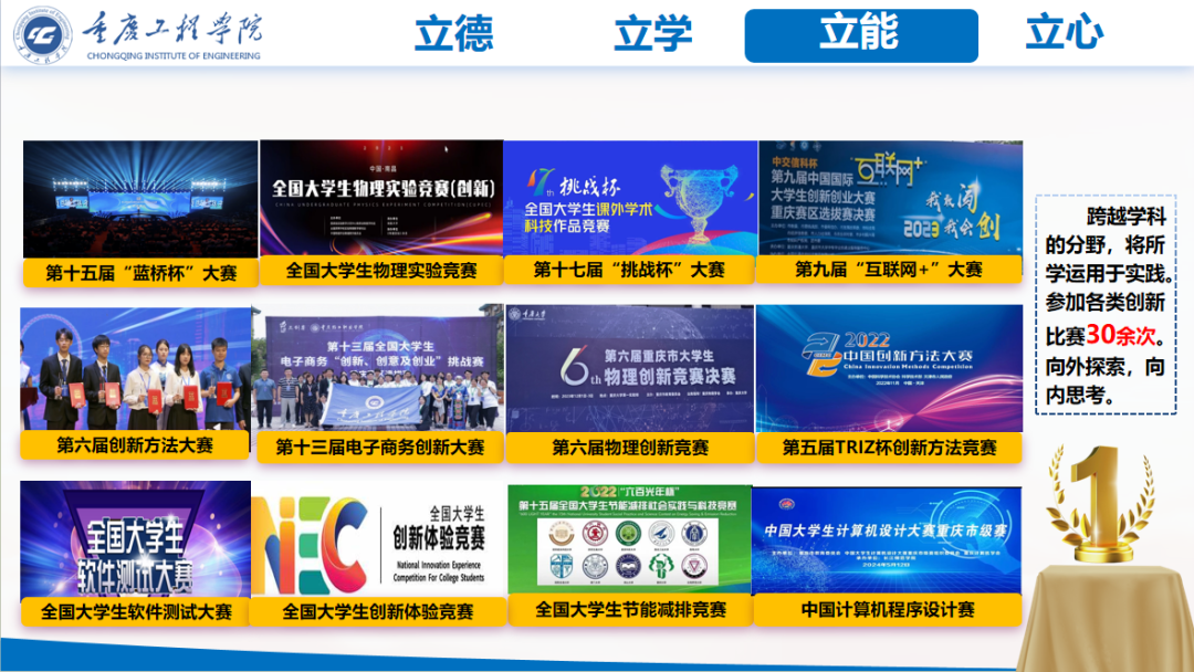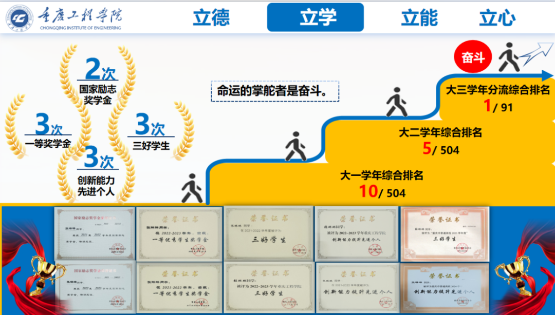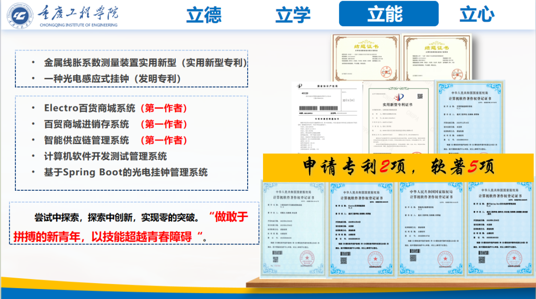 在校期间,荣获国家励志奖学金2次、学校一等优秀学生奖学金3次,大三学年专业排名第一;曾任重庆市辅导员工作室学生助理负责人、软件测试联盟协会负责人、FSTesting工作室负责人等,累计策划组织、工作室活动70余场;积极参加各类学科竞赛,以赛促学,在“挑战杯”“互联网+”“三创”等比赛中斩获佳绩;荣获“三好学生”“创新能力先进个人”“优秀社团学生干部”等荣誉称号,累计荣获国家级、省市级、校院级荣誉证书60余项;考取国家级职能证书2项,发表学术论文4篇,授权软件著作权5项,发明专利等2项,主持国家级、省部级、校级大创项目4项并成功结项2项。