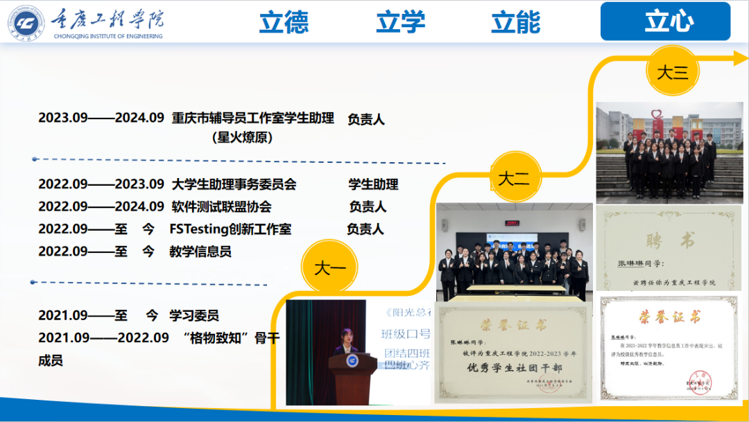 “人生在勤,不索何获”,从班级学习委员到校级社团负责人,从一个人到一群人,秉承着为学院奉献为同学服务的初心,她共计统筹管理200余人,组织大小活动50余次,在学业上拓展学校测试专业竞赛方向,在行为上共同参与学风建设。获得优秀教学信息员、优秀社团学生干部等荣誉称号,乘一份荣誉,肩一份责任,在校期间还参与巴南职教中心、七彩假期关爱儿童等社会实践活动,获得青年之星等荣誉称号,成为被看见和被需要的人,“做肩上有责的新青年,以担当彰显青春力量”。