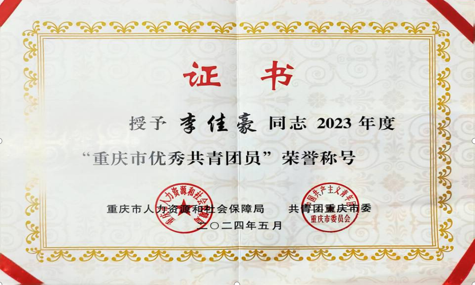 2020年,他加入中国共青团,成为一名共青团员。为了寻求思想上的进步,他不断加强理论学习,积极组织团日活动,参加各式各样的党日活动,不断提升自己的思想认识。2022年他递交入党申请书,在组织的悉心培养下,在老师和同学的帮助下,一步一步加入了党组织,成为了一名中共预备党员。他的进步也得到了认可,多次受到学院、学校的表彰,获得了“2023年度重庆市优秀共青团员”的荣誉称号,是我校唯一获得此殊荣的同学。