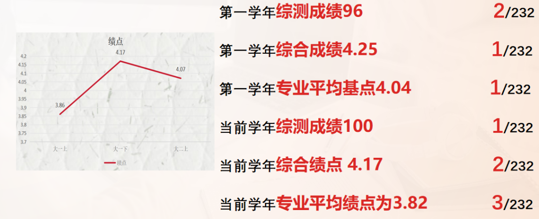 时光荏苒,李佳豪同学在大学的旅途上不断探索知识的边界。他坚持着“好问则裕,勤能补拙”的学习态度,以自主学习为桨,以制定计划为帆,驶向知识的海洋。第一学年综合绩点专业第一,第二学年的综合绩点专业第二,这一步步的攀登,都是他勤奋努力、不懈拼搏的成果,是他勤学善思、立志笃行的见证。他将这三年的学习生活比作一颗种子的萌发与成长,经历了各种挑战与考验,如今已开始枝繁叶茂,预示着未来的开花结果。在追求学术卓越的同时,他也在心之所向的道路上找到了自己的平衡点,不断自我超越,以青春之我创造青春之辉煌。