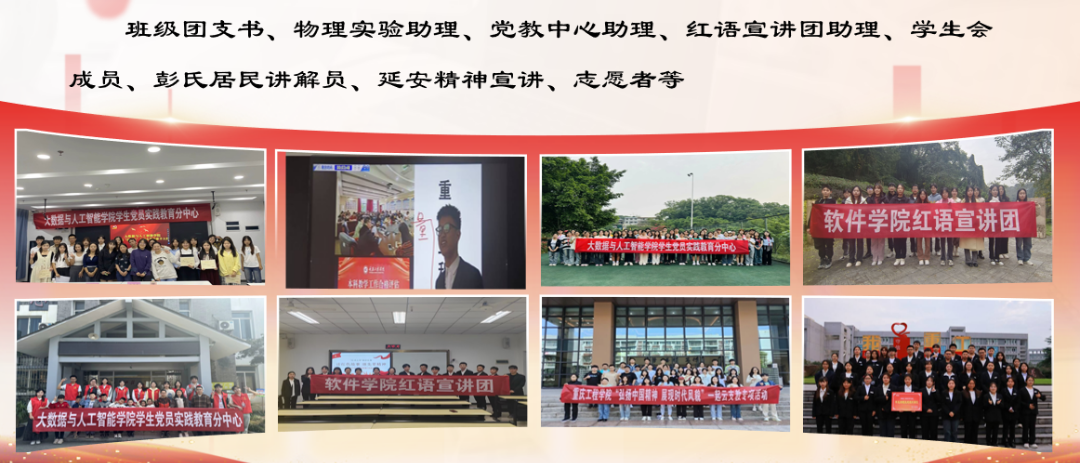 在校期间,荣获国家励志奖学金1次、学校优秀学生奖学金2次,大一综合绩点专业第一,大二综合绩点专业第二;党教中心助理,班级团支书,物理实验助理,大学生服务中心宣传部负责人,同心宣讲团成员;积极参加竞赛,在“泰迪杯”“计算机设计大赛”“物理实验竞赛”等比赛中斩获佳绩;荣获“三好学生”“创新能力先进个人”“艺术先进个人”等荣誉称号,累计荣获国家级奖项5次、省市级奖项6次、校院两级荣誉证书40余次;考取国家级职能证书3项,献血血浆超2000ml,志愿服务学时超900小时。