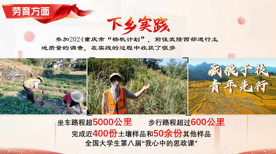 不积跬步无以至千里,为了全面发展,他担任了班级团支书,党教中心助理等一系列职位,在工作中认真负责,带领班级获得了五四红旗团支部和先进班集体等荣誉,自己也获得了优秀学生助理的荣誉称号。此外。他还积极参加社会实践,今年暑假,他参加了2024重庆市扬帆计划,前往武隆西部进行土地质量调查,在调查过程中,他累计乘车路程超过5000公里,步行路程超过600公里,最终完成了400余份土壤样品和50余份其他样品的取样工作,为乡村振兴贡献了自己的力量。同时,他们将实践经历精心制作成视频《藏粮于地,青年先行》,代表学校参加了由教育部组织的第八届全国大学生“我心中的思政课”比赛。