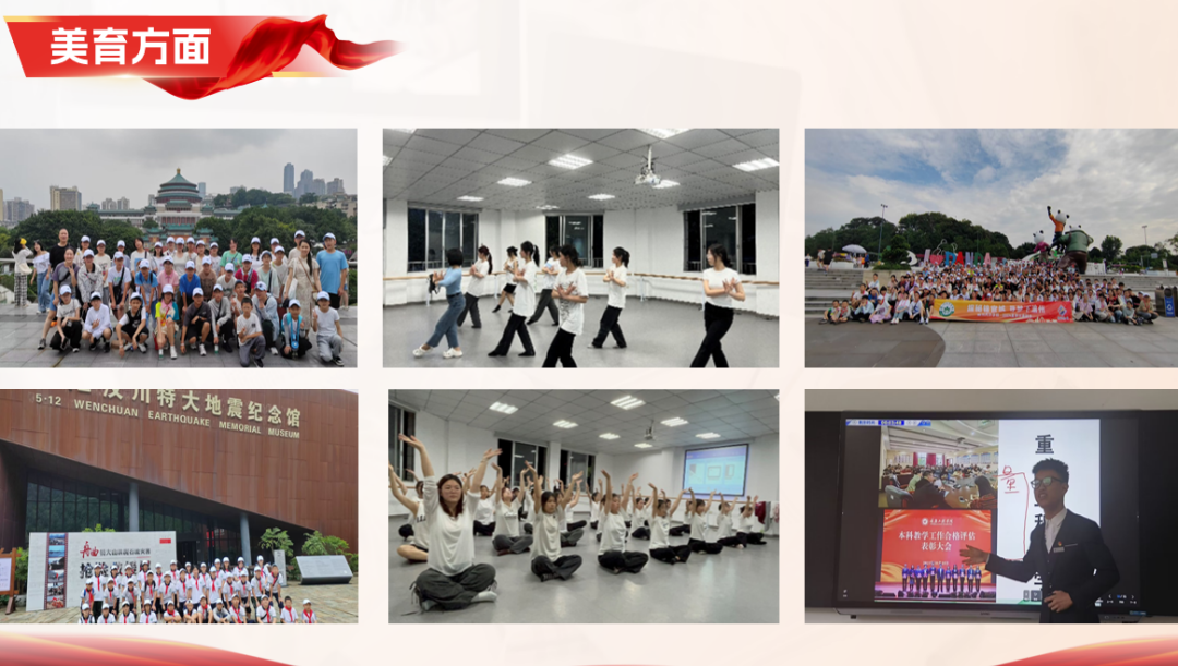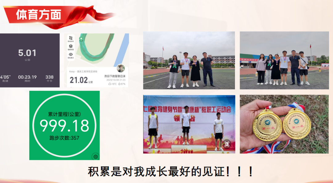 他始终坚持运动,从3公里到21公里,奔跑的里程见证了他的成长。在运动会上获得了男子组1.5公里和5公里的第一名。健强了体魄,他又开启了寻美之旅,先后学习了傣族舞、合唱指挥等,在学校的1+N的科学培养下,他考取了导游证。今年暑假,带领浙江省衢州市的小朋友参观川渝的红色文化和美丽景点,从美的享受者转化为美的传播者。