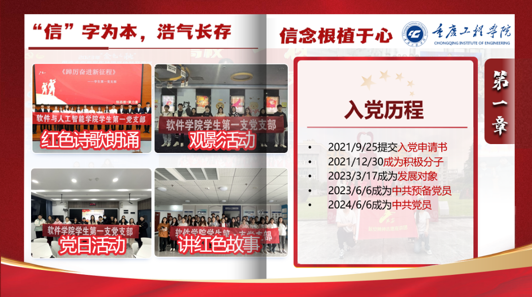 人生如书,卷卷长,执笔绘章,熠熠光,每个人的青春都是一本书,作为重庆工程学院软件学院21软工2班的一员,她用四年的时光书写了一部以“信、勤、实”为主线的青春之作。