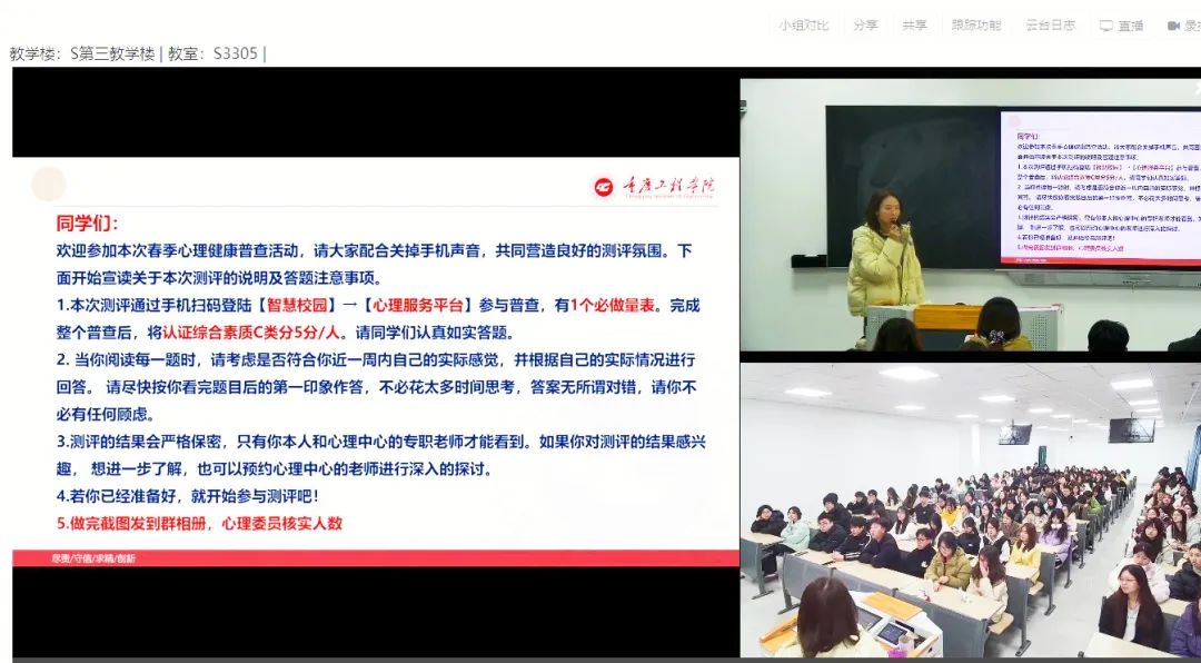 心理健康是不容忽视的成长航标。班会上,双桥校区张阿凤老师从学业压力、人际关系等角度进行切入,分析了心理健康问题出现的可能原因和初步症状,引导同学们应树立积极乐观的心态,时刻关注个人情绪的变化与心理健康问题的防护。最后,张老师还组织同学们完成了3月心理健康普查,进一步鼓励同学们要勇敢面对心理困惑,学会自我调节和寻求帮助。