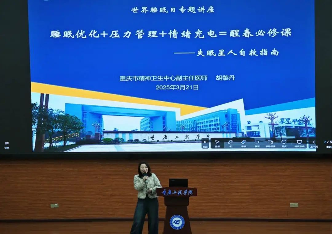 为普及睡眠健康知识,提升大学生睡眠质量与心理健康水平,在第24个世界睡眠日到来之际,重庆市精神卫生中心副主任医师胡黎丹于2025年3月21日在7807为同学们带来了世界睡眠日专题讲座。