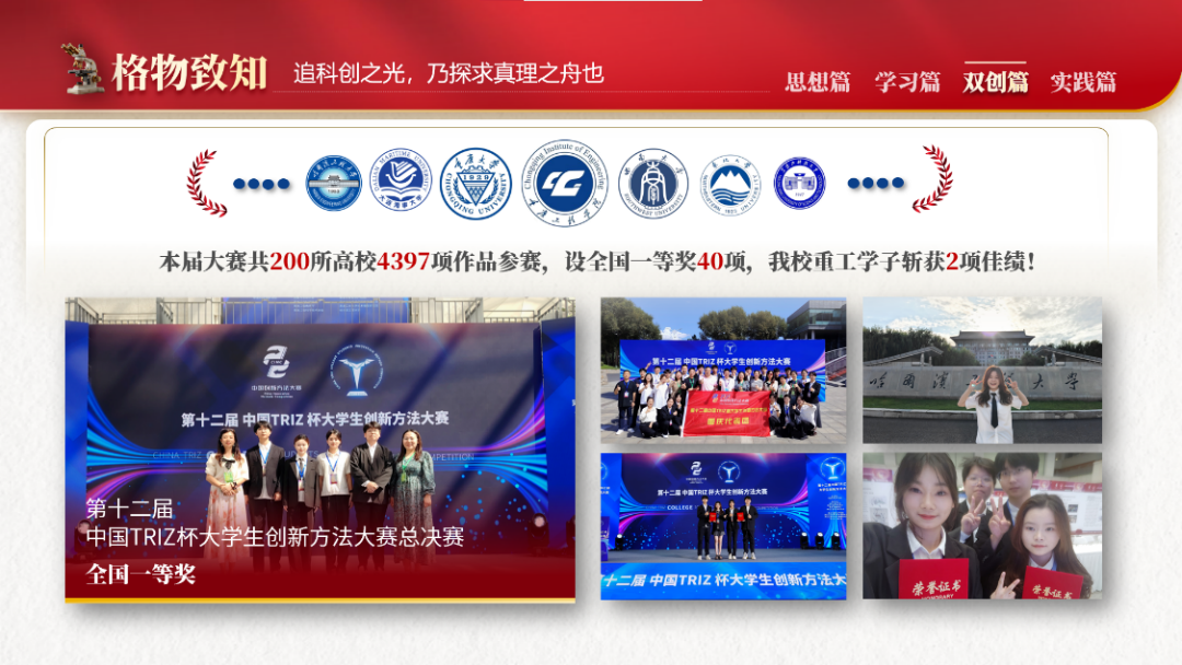 同年9月,参加重庆市创新方法大赛,从一无所有,逐渐做出实物、专利、论文等成果,最终有幸在全国决赛中参与学习。参加多项竞赛得益于学校大力创设工作室平台;鼓励重工学子勇于创新、勇攀高峰。今年暑假,学校负责人带领她们勇赴哈尔滨,在哈工程大学顺利完成比赛,获得全国一等奖,实现了我校在此赛项上的历史突破。该项比赛利用科学的方法论解决实际问题,展现创新思维,吸引了来自全国200所高校共4397项作品参赛。我校重工学子在全国性的竞技舞台上依然毫不畏惧,敢于亮剑,斩获佳绩。在参与比赛的同时,她还勤于总结所遇到的创新点,累计发表学术论文3篇、实用新型专利1项、申报市级创新创业项目1项。