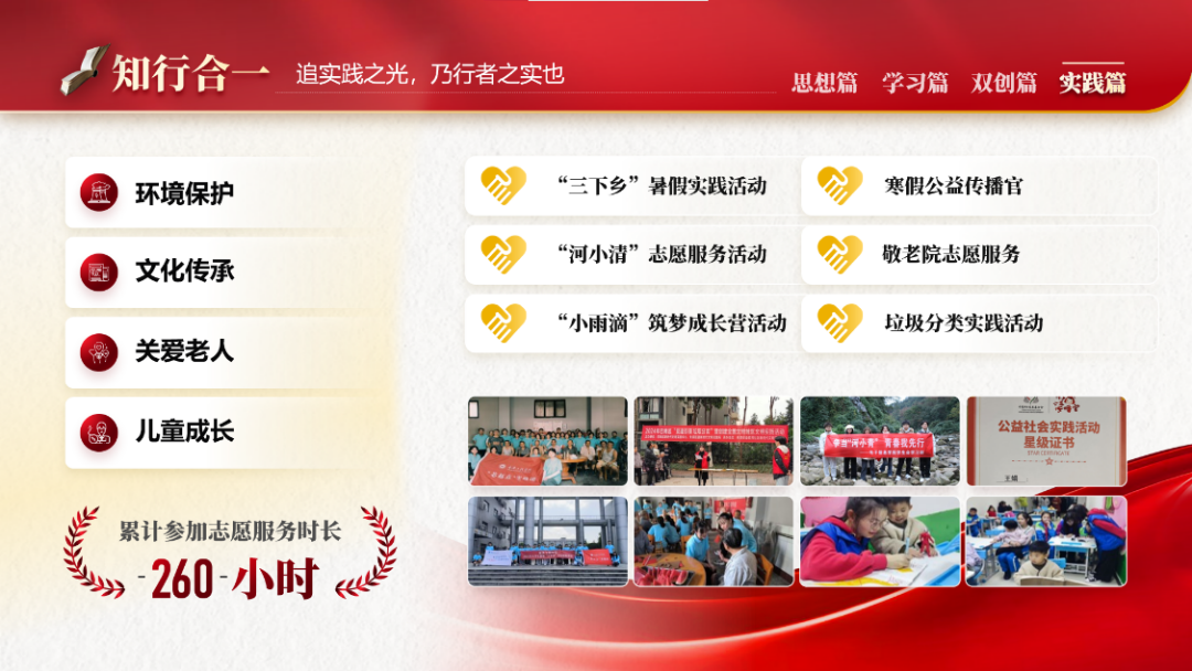 丰富多彩的校园生活深深镌刻在她的成长足迹中。除了校内活动,她还积极参加校外志愿服务,参与助力环境保护、文化传承,累计志愿服务时长达260小时。从校内到校外,在党的思想指引下,回馈社会,争做新时代的四有青年。“播种耕耘终有收”,努力的最后终究会有收获,大学期间累计获得国家级奖励7项,省市级奖励8项,校院两级奖励三十余项。