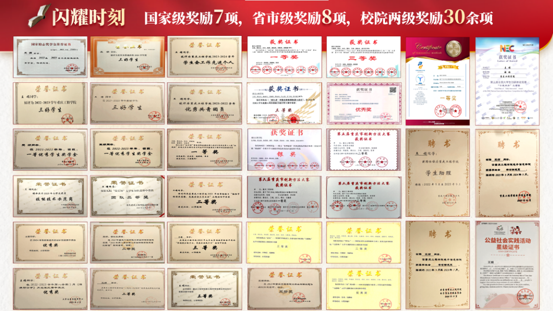 在校期间,荣获国家励志奖学金1次、学校一等优秀学生奖学金3次,大三学年专业排名第二;曾担任机器人与智能控制创新中心负责人,学院学生会学习部成员等,累计策划组织学院、工作室活动60余场;荣获2024年第十二届中国TRIZ大学生创新方法大赛全国一等奖、2023年大学生机器人科技创新交流营全国三等奖、第十八届“挑战杯”全国大学生课外科技作品竞赛一等奖、重庆市“三好学生”、连续三年校“三好学生”、“优秀共青团员”、“学生会工作先进个人”、大学生党员“技术技能示范岗”等荣誉50余项;考取国家级证书3项,发表论文3篇,获批实用新型专利1项。