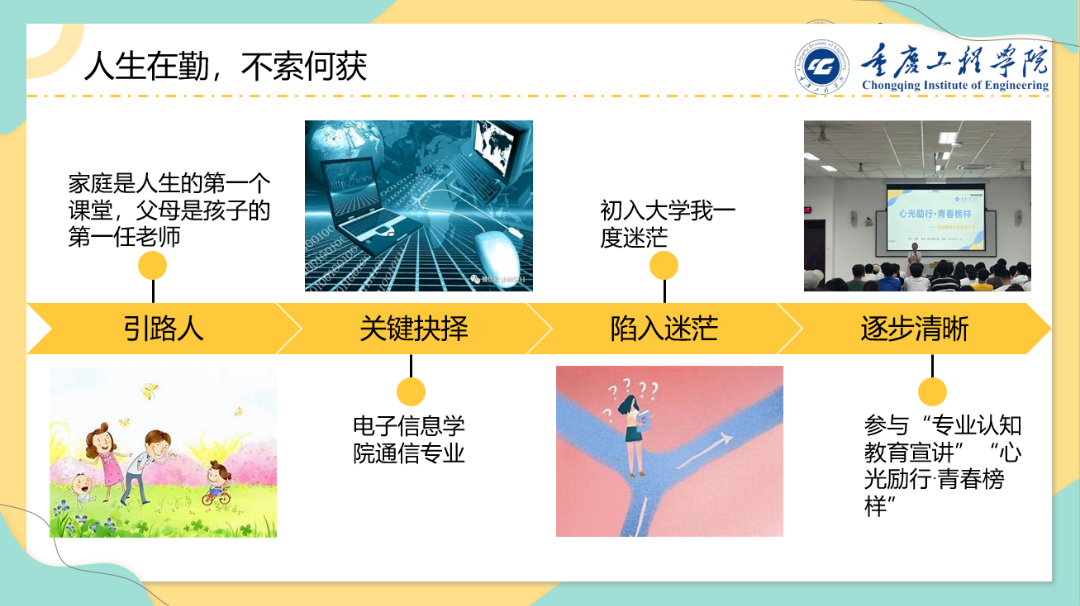 在校期间,荣获学校优秀学生奖学金2次,学院“十佳学习标兵”1次,大二学年专业排名第二;曾任辅导员助理、加入创新创业学院、加入学风管理部门,担任“电子与通信信息研究中心”骨干成员,累计策划组织、工作室活动20余场;积极参加竞赛,在“挑战杯”“中国国际大学生创新大赛”“蓝桥杯”等比赛中斩获佳绩;荣获“三好学生”“创新能力先进个人”“优秀共青团员”等荣誉称号,累计荣获国家级、省市级、校级荣誉证书20余项。