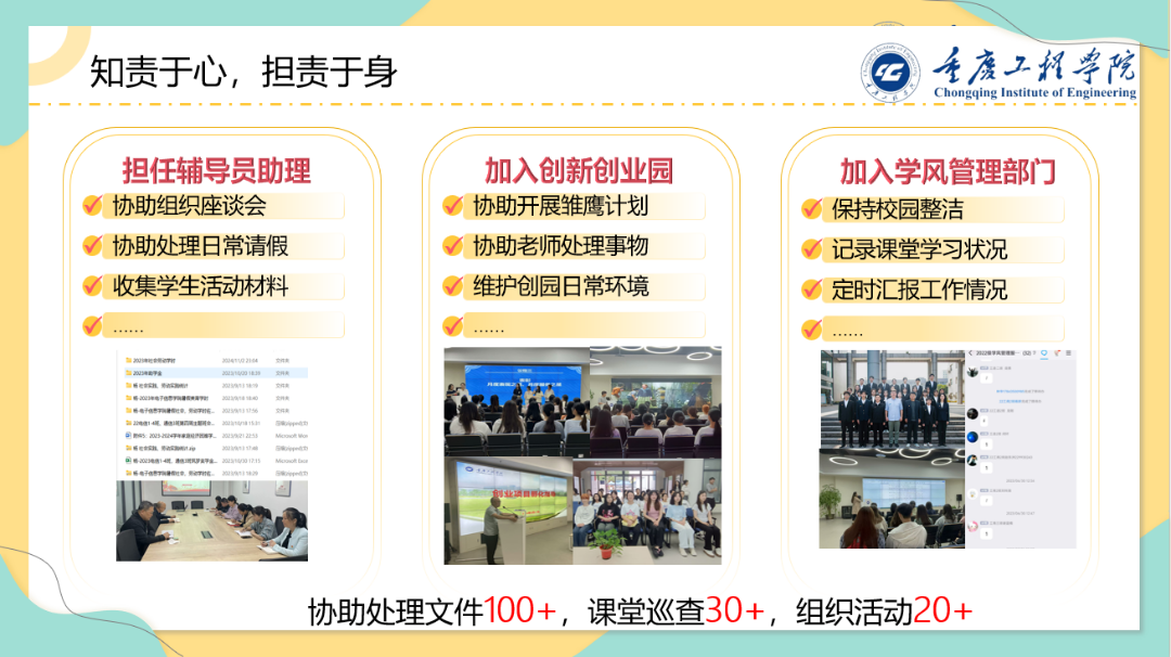 托尔斯泰指出:“一个人若是没有热情,他将一事无成,而热情的基点正是责任心。”她深知在大学里不仅仅有学习,与集体相互交流也是大学生活中不可或缺的一部分。在校期间她积极担任辅导员助理,加入创新创业园,加入学风管理部门,协助老师处理日常事务,帮助同学解决疑惑,协助创园中心开展雏鹰计划的工作,同时督查课堂纪律并维护校园环境。此外她还积极投身于校内外活动,累计参与和组织活动200余场。