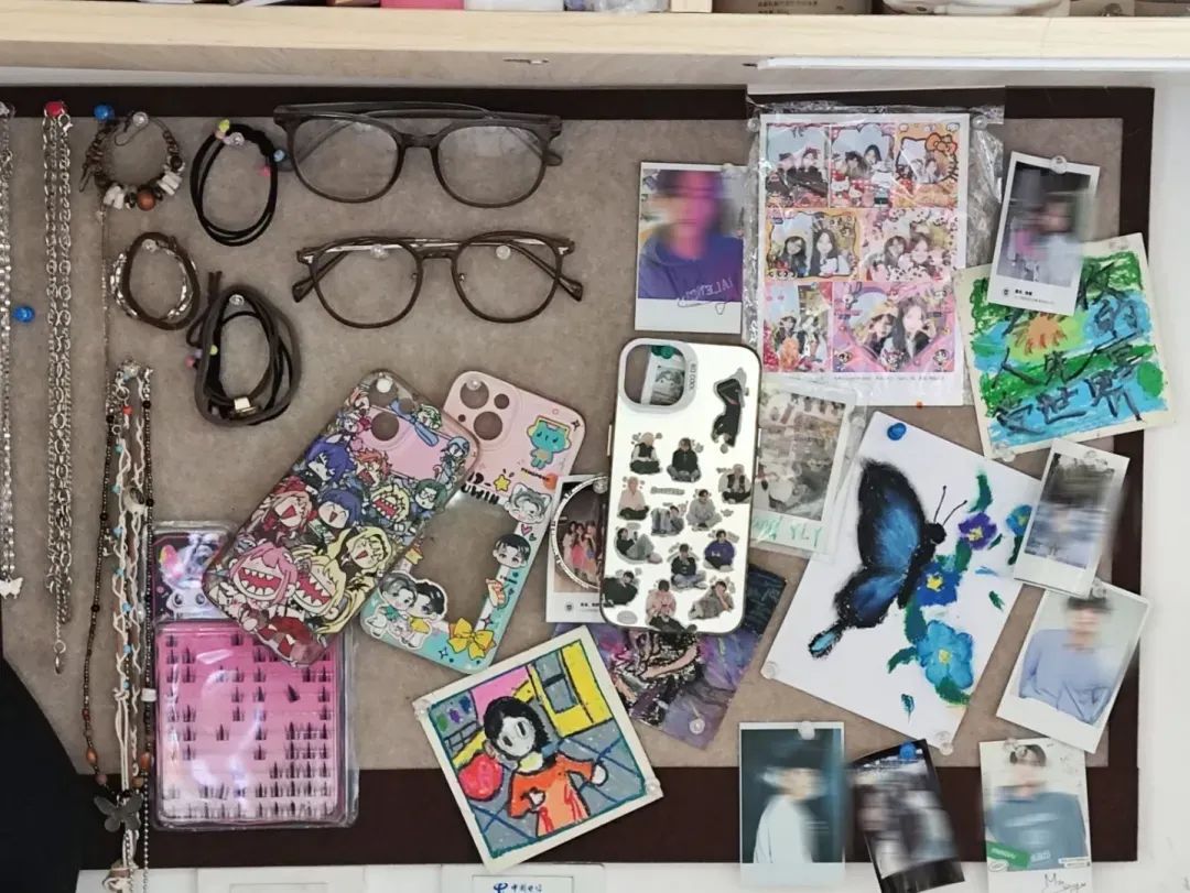 毛毡板是宿舍的 “记忆博物馆”。照片记录着旅行的风景、朋友的笑脸,手绘的蝴蝶与画作绽放艺术气息,还有偶像的照片、手作卡片,每一样都承载着热爱。