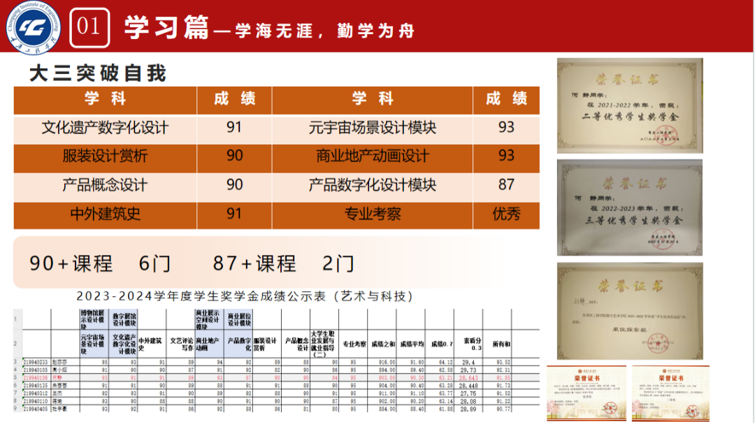 大一,面对绩点的低谷,她未曾有过丝毫的动摇与退缩。相反,这成了她内心更加坚定的力量源泉,激励她以更加饱满的热情和更加坚定的决心,投身于知识的海洋。她深知,学习之路从无捷径可走,唯有脚踏实地,方能行稳致远。于是,她选择了一条看似缓慢实则稳健的道路。她不急于求成,不追求速成的辉煌,而是愿意投入大量的时间与精力,去深入理解每一个理论框架,去细致分析每一个实践案例。直至绩点飙升至4.0以上,综合排名跃居专业前三,这一切的成就,都源于她那份对知识的执着追求和对学习的深刻理解。她用自己的实际行动诠释了“慢工出细活”的真谛,也证明了在艺术与科技的广阔领域里,唯有脚踏实地、持之以恒,方能绽放出属于自己的璀璨光芒。