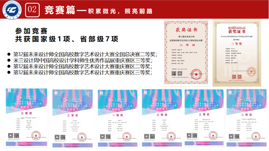 竞赛,不仅是技能与实力的较量,更是毅力与决心的比拼,激发着每个人内心深处的潜能与激情。她认为“持续学习、深入思考”能够不断积累知识的宝藏,挖掘知识的深度。大三以来,参加各类比赛15余次。丰富的赛事经验既提升了她的专业知识,又培养了她的创新思维能力。累计获得荣誉共16项,其中国家级1项,省市级7项。