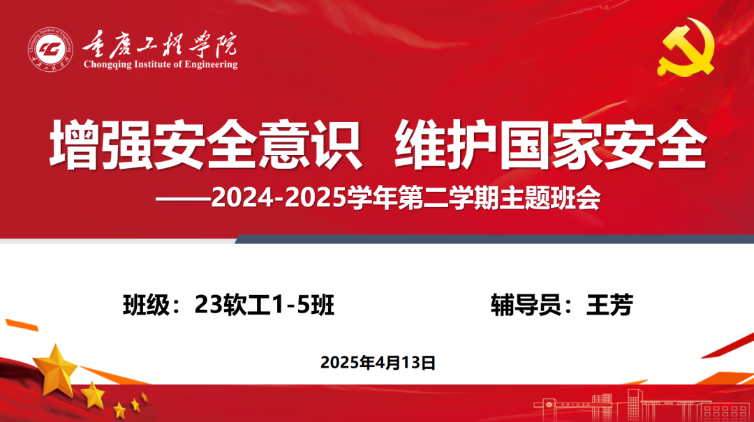 为了深化同学们对总体国家安全观的理解,筑牢安全防线,增强安全意识。2025年4月13日18点,23软工1-5班在辅导员王芳老师的组织下召开“增强安全意识,维护国家安全”主题班会。本次班会旨在引导同学们树立总体国家安全观,增强安全意识,筑牢安全防线。