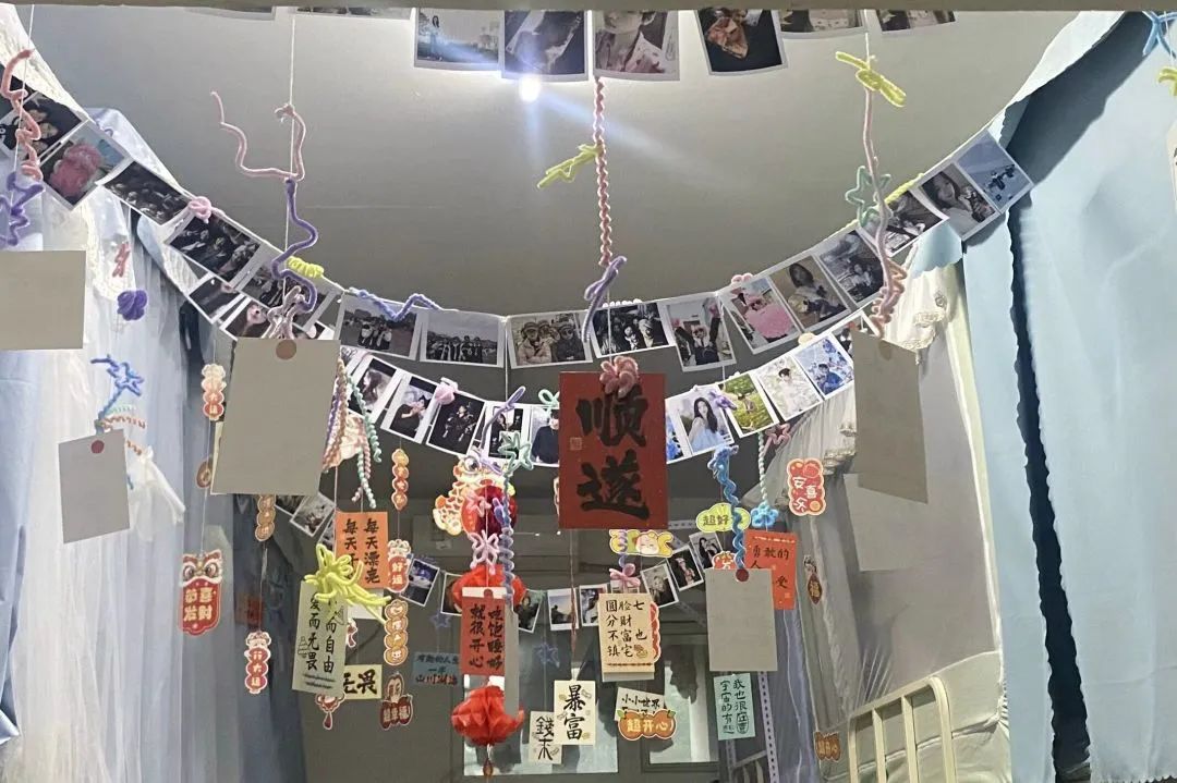照片墙挂满了笑脸与回忆,五彩的装饰随风轻晃,仿佛在诉说着室友间的趣事。这里不只是休息的地方,更是温暖的港湾,每一个小装饰都是青春的印记,每一张照片都是时光的珍藏。住在这样的宿舍里,每天都被幸福包围,连空气都充满了甜甜的回忆。