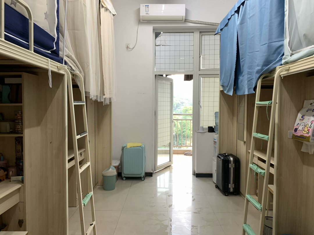 宿舍地面干净亮堂、行李箱摆放有序,垃圾桶归置在宿舍一角 。窗外正是绿意盎然,阳光透过门窗溜进宿舍,让整个宿舍显得敞亮又清新,处处都是春的气息。