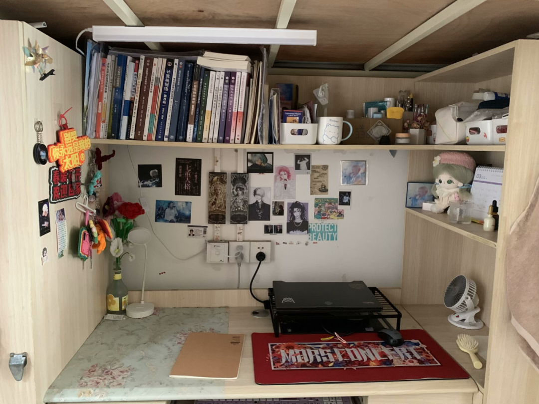 桌面一尘不染,常用书籍在一侧整齐码放着,纸巾盒居然学会壁挂术,在桌旁支棱起小帐篷,连抽三张都不会塌房。上方置物架书籍排列得整整齐齐,像等待检阅的士兵。哆啦A梦等可爱摆件点缀其间,给严肃的“阅兵环节”添了几分俏皮。这一方小天地,便是宿舍的温馨港湾,承载着我们的日常与梦想。