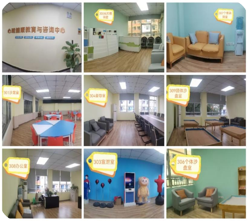 重庆工程学院心理中心坐落在南泉校区大学生服务中心3楼和双桥校区办公楼5楼,总面积达760余平方米,功能房共计21间。包括个体咨询室4间,团体辅导室3间,沙龙活动室1间,心理沙盘室3间,宣泄室2间,音乐放松室1间,督导室1间,办公室2间,档案室1间,预约接待室+阅览室1间。