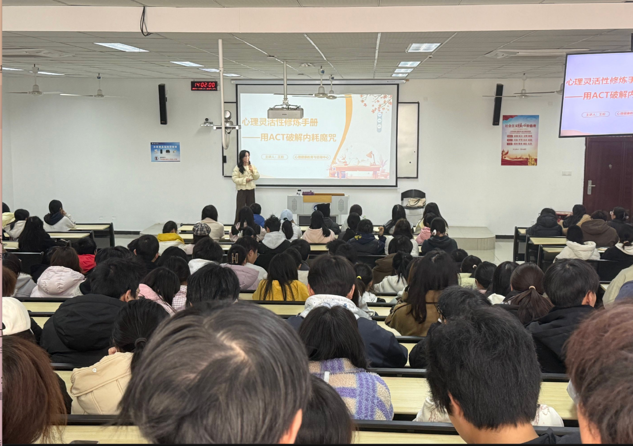 为帮助大学生有效识别并缓解精神内耗,提升心理调适能力与生活幸福感,我校心理健康教育与咨询中心于2025年11月26日下午14:00 - 15:00,开展了主题为《心理灵活性修炼手册——用ACT破解内耗魔咒》的专题心理讲座。本次讲座由王姣老师主讲,共有204名大学生积极参与,现场氛围热烈、互动性强。