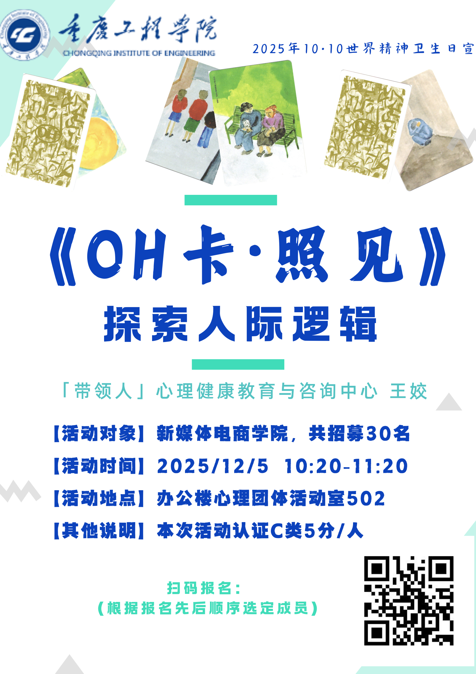 当前大学生处于人际关系发展关键期,在寝室相处、团队协作、亲密关系等场景中常遇沟通壁垒与角色困惑。为此,心理中心王姣老师于2025年12月5日上午10:20 - 11:20,带领27名学生借助卡牌互动,帮助大家觉察自身社交模式、学会换位思考,解锁实用的人际沟通智慧。