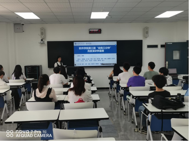 (文/图 软件学院 吴琳玉)为了更好地提升软院学子的积极性,增强大家的自信心与表达能力,提升晨课质量,促进《演讲与口才》课程的发展,软件学院于4月27日在7408教室开展了第三期“给我三分钟”月度演讲争霸赛。