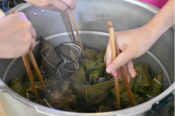 活动一开始,同志们便用自己携带的碗具取走自己需要的原材料,并分成几个小团队进行粽子制作。会包的同志们现场教学,网络教学视频滚动播放,同志们现学现卖,各显身手,有的粽叶破了,有的米漏了,但这些问题最终都在团队协作中得到解决,同志们都乐在其中。最后,在一粟堂一楼“灌汤包”窗口的帮助下,经过漫长的蒸煮,同志们品尝到了自己的劳动成果,在劳动中感悟非遗文化。