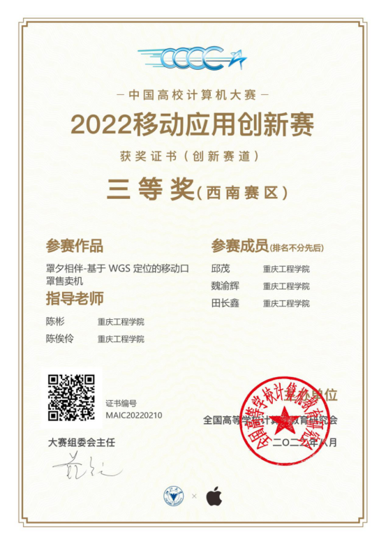 本届“中国高校计算机大赛”是由全国高等学校计算机教育研究会主办。其中“移动应用创新赛”作为“中国高校计算机大赛”的竞赛模块之一,由浙江大学、苹果公司联合承办。本届比赛在赵商、陈彬、陈俟伶等老师的悉心指导下参赛,其中赵商老师指导学生邱兴亮、刘林言、王俊瑶的参赛作品“神农百草堂”获得西南赛区二等奖,陈彬、陈俟伶老师指导学生邱茂、魏渝辉、田长鑫的参赛作品“罩夕相伴-基于WGS定位的移动口罩售卖机”获得西南赛区三等奖。