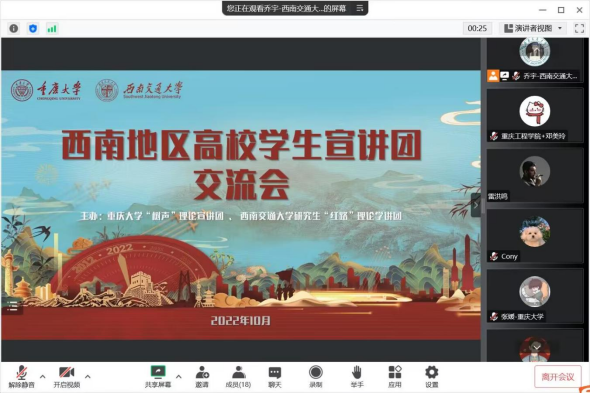 (文/图 软件与人工智能学院 李佳玲)为迎接党的二十大胜利召开,深入学习贯彻习近平新时代中国特色社会主义思想,加强西南地区学生宣讲团交流,10月15日,重庆大学“树声”理论宣讲团联合西南交通大学研究生“红路”理论学讲团开展西南地区高校学生宣讲团线上交流活动。我院“云智”宣讲团及电子科技大学、重庆大学等11所高校宣讲团队参与交流。