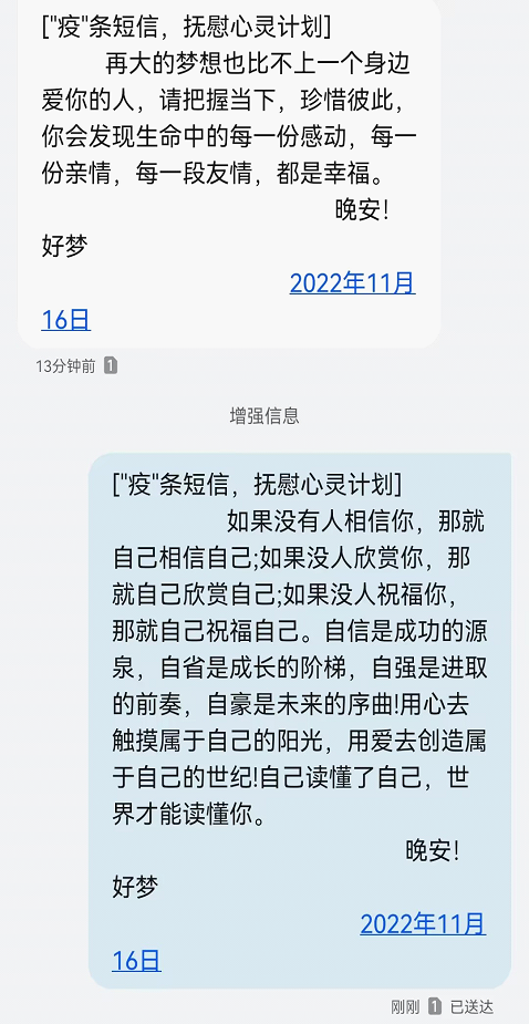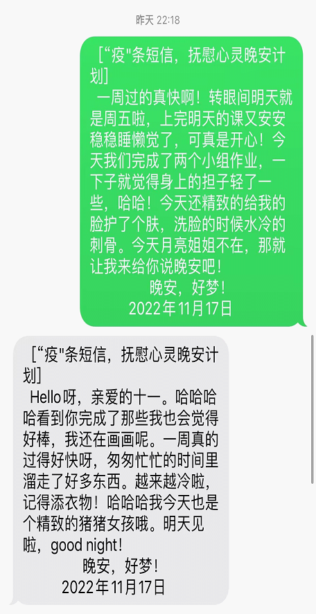 在这五天的时间里,同学们每天晚上与自己随机分到的组员通过短信用幽默、深情、温暖、励志的文字分享彼此在大学期间的学习、生活感悟,鼓舞对方时刻保持积极乐观的心态,共克时艰,携手抗疫,传播温暖与美好。晚安计划活动以一种新颖的方式向同学们传递爱的力量。