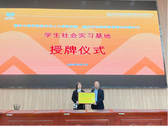 (图/文 软件与人工智能学院 王惠俊)3月1日,软件与人工智能学院党总支书记刘子菱、人工智能系主任陈怡然、学生科长李阳、团委书记王惠俊一同前往重庆市巴南区教育综合实践中心,开展社会实践基地授牌暨科普公益讲座。巴南区教育综合实践中心主任杨伟斌接受授牌。