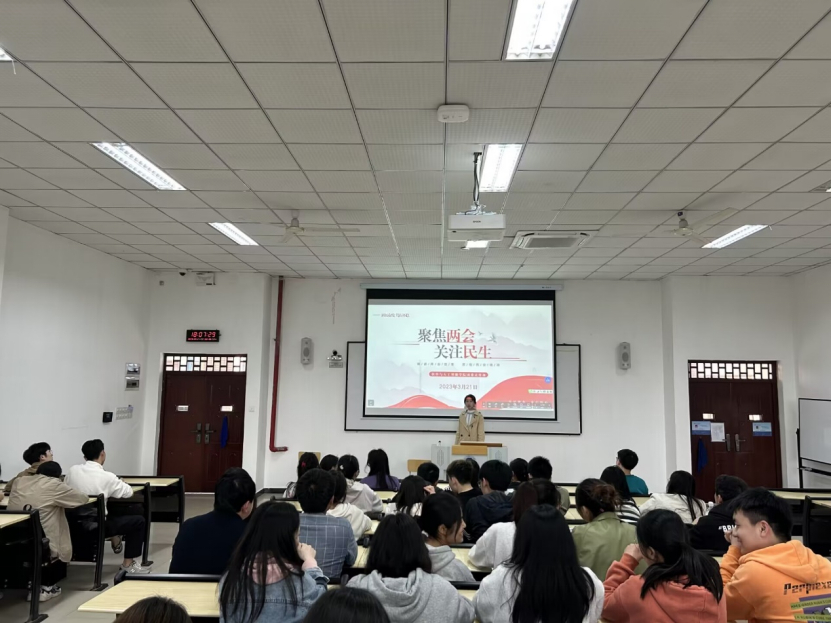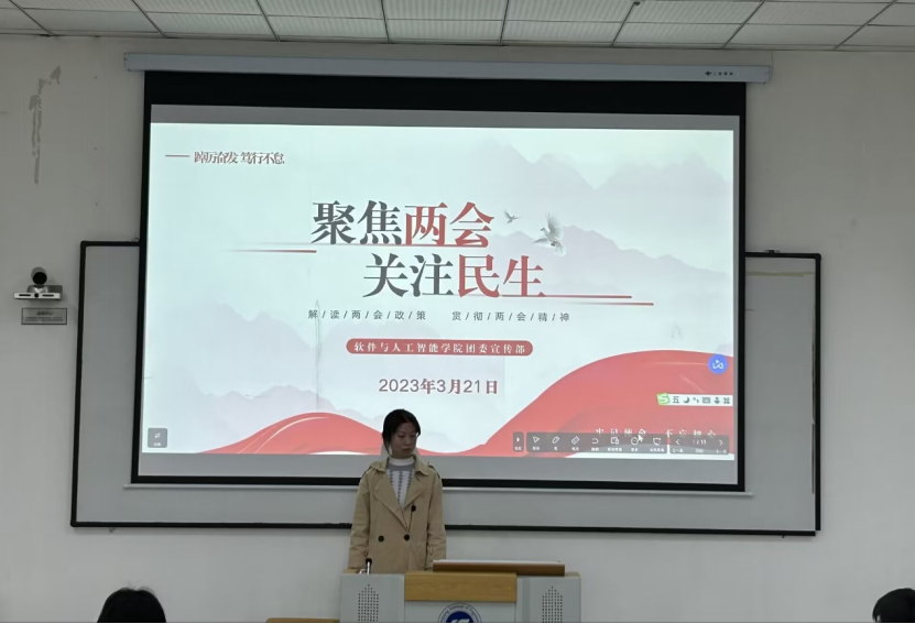 /文 软件与人工智能学院 辜虹蕊/宋艺如)为了解国计民生,学习贯彻全国两会精神,提高同学们的政治素养学院分团委宣传部3月21日在6201开展了主题为“聚焦两会 关注民生”专题学习会。本次会议从两会的核心热点问题以及两会精神方面等多个角度进行学习团委学生会全体成员参加。