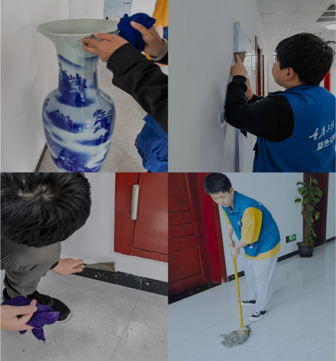 活动期间,工作人员分配好每个人的任务,随后发放完打扫工具后,志愿者们就开始进行卫生打扫。他们用抹布认真擦拭文化墙边线的灰尘以及花盆周边的污渍,用铲子仔细铲除走廊墙角的瓷砖、消防栓、开关等卫生死角的污渍。经过大家的不懈努力,教学楼变得更加干净整洁。同学们也体会到劳动的艰辛与不易,同时深刻感受到通过自己的劳动取得成就的快乐。