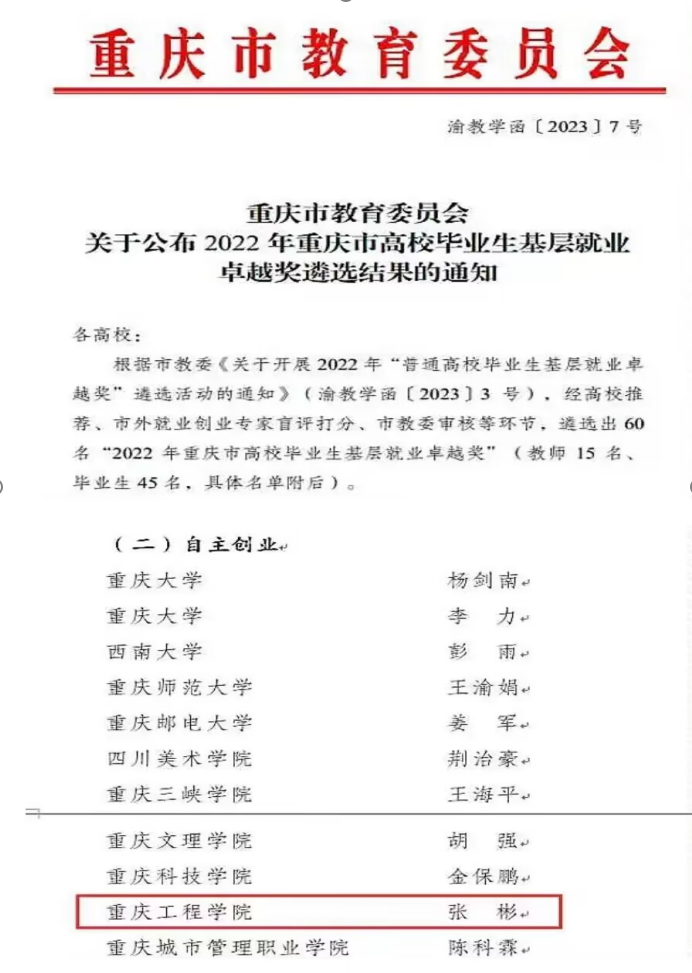 近日,重庆市教育委员会发布《重庆市教育委员会关于公布2022年重庆市高校毕业生基层就业卓越奖遴选结果的通知》(渝教学函〔2023〕7号)。我院2014届软件工程毕业生张彬荣获“2022年重庆市高校毕业生基层就业卓越奖(自主创业)”。