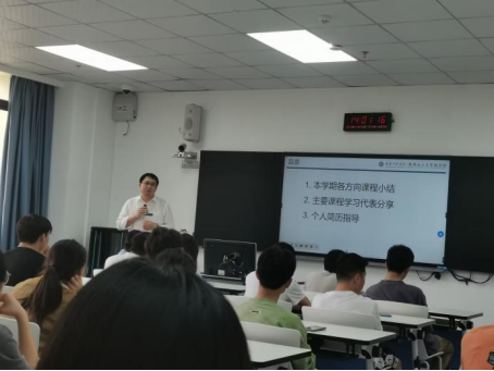 首先,班导师谭舸对本班本学期各专业方向课程进行了小结并着重讲解了如何进行未来发展规划。四位不同专业方向的同学就专业学习及个人实习就业情况进行了分享。最后,谭老师详细讲解了个人简历的制作,并对同学们的简历进行了相应的指导,鼓励同学持续提升自身专业能力。