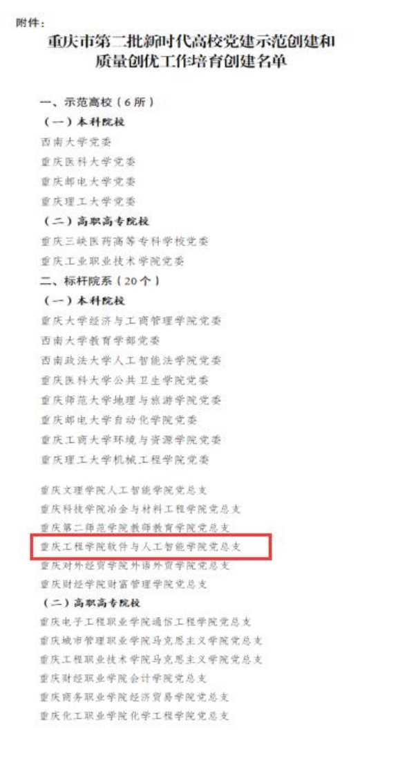 / 软件与人工智能学院 宁丽丽日前,重庆市教育工作委员会公示了重庆市第二批新时代高校党建示范创建和质量创优工作培育创建名单,软件与人工智能学院党总支成功获批标杆院系培育创建单位,同时,学院党总支还荣获市委教育工委2023年先进基层党组织荣誉称号。
