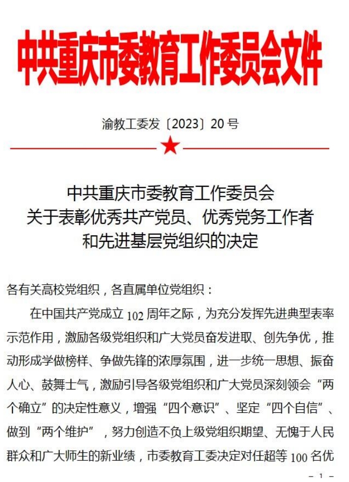 喜报:我院党总支成功获批重庆市党建“双创”标杆院系培育创建单位